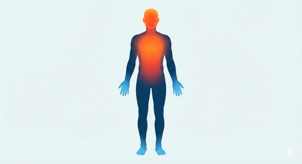 冷え性に悩む方の多くは、意外なことに**「脳や内臓の温度(中心部)が高くなりすぎている」**状態にあります。いわゆる「のぼせ」に近い状態です。